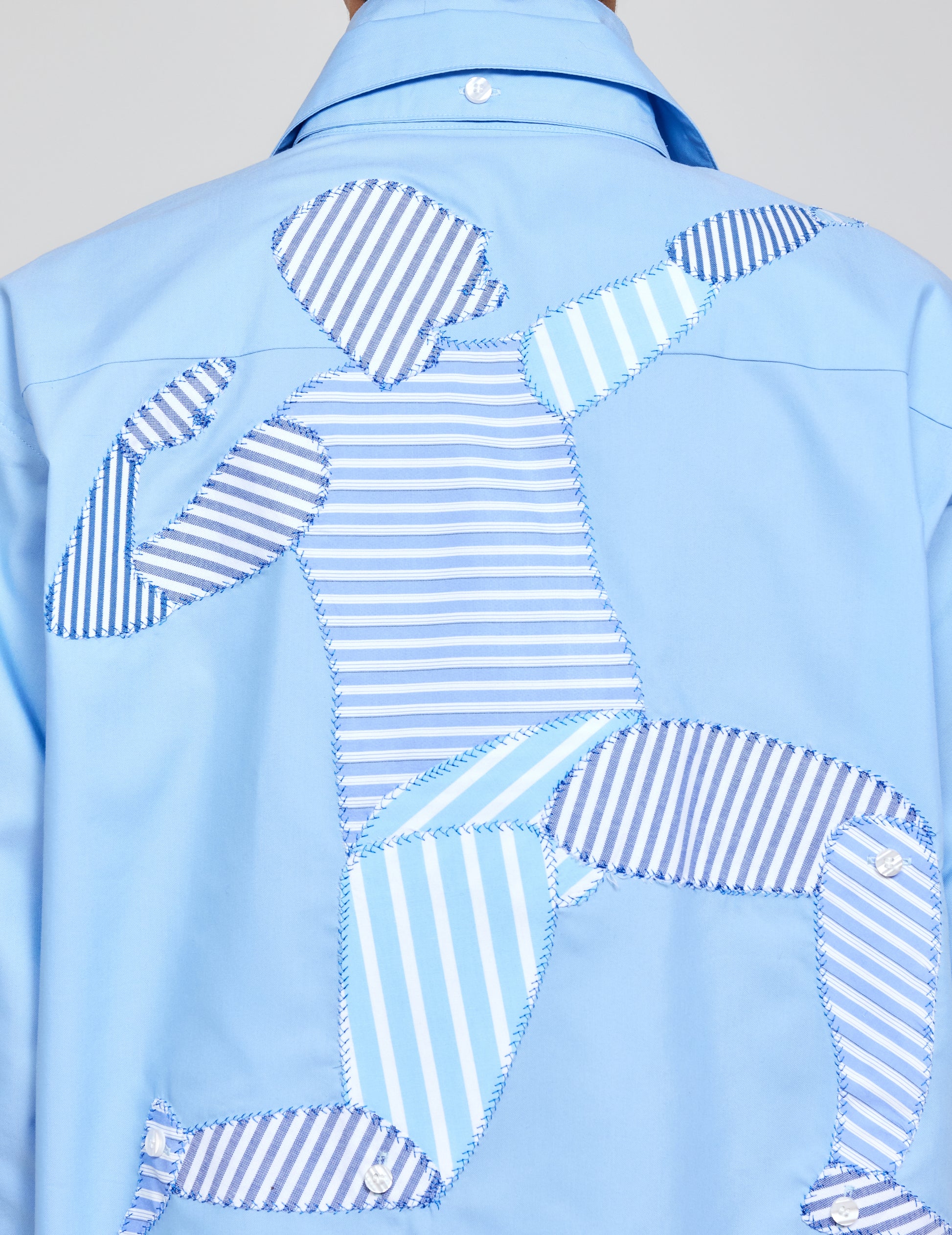 Sky blue poly-cotton shirt featuring patched cutouts of deadstock striped fabric forming player silhouettes across the front and back.