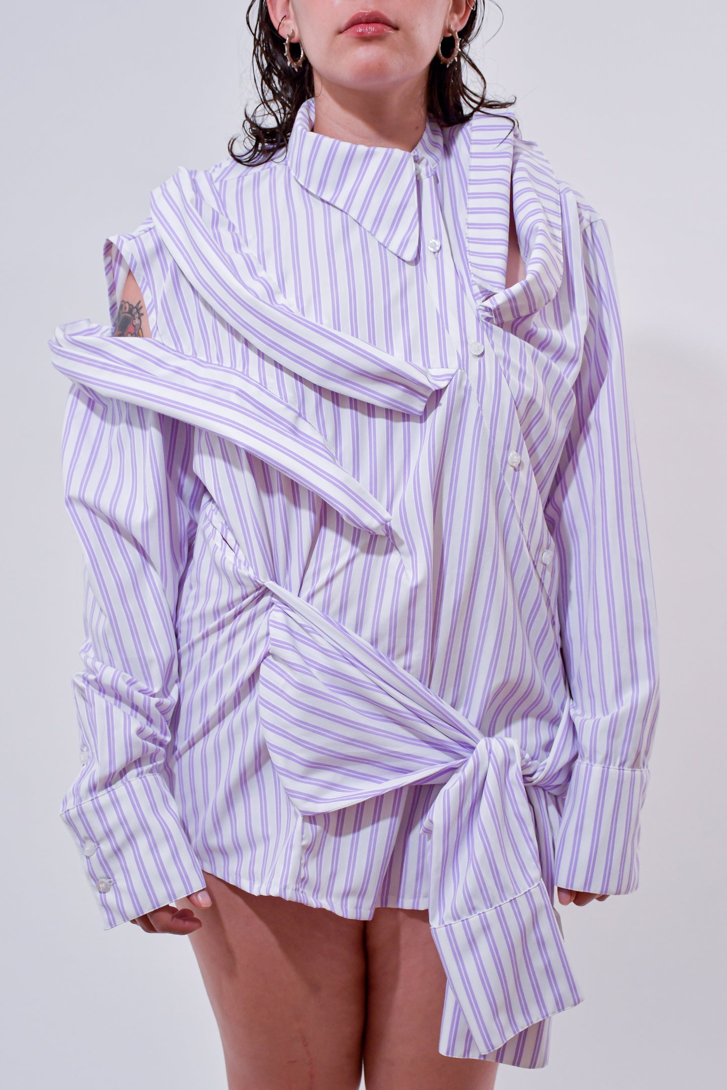 The Multitasker Shirt is a reconstructed shirt designed to elevate your style. With its lapel-collar cut out details on the front and back, and French seams on the inside, this versatile piece is a must-have. Available in OS sizing, it fits from S to L. Crafted from 100% polyester, it features two extra sleeves and can be worn tucked, oversized, or as a dress. Made in Mexico, this shirt is perfect for anyone seeking a fashion-forward statement.